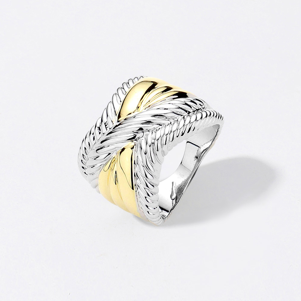 Details • Size : 0.7" H • Make a lasting impression with this bold crossover statement ring featuring a unique dual-tone finish and textured detailing. Its wide band design adds a touch of sophistication, making it perfect for both everyday wear and special occasions.