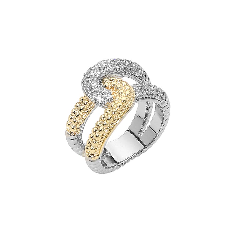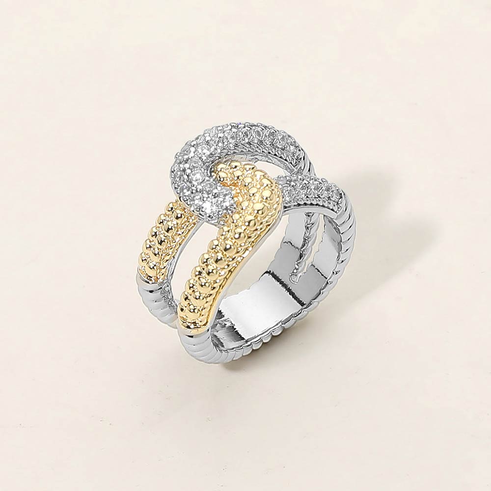 • Eye-catching crossover statement ring featuring twisted textured bands paired with a sparkling pavĂ© curve for added dimension and shine. Designed to stand out, this bold ring delivers a modern layered look that elevates everyday outfits and special occasion styling effortlessly.