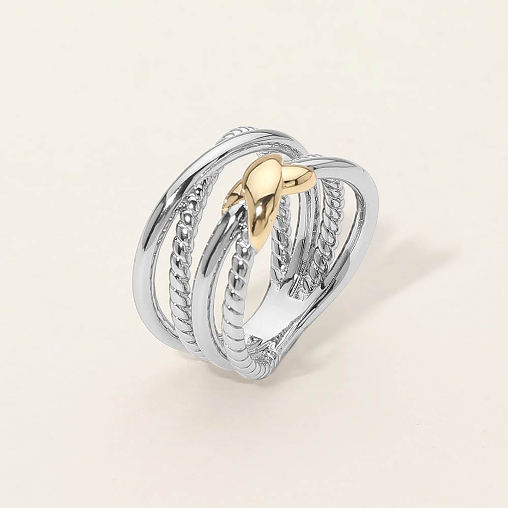 Details • Size : 0.5" H • This statement ring showcases an interwoven band design highlighted by a crisscross accent at the center. The layered textures and flowing curves create depth and visual interest, offering a bold yet romantic look. Designed to stand out, this ring pairs effortlessly with everyday outfits or special occasion styles for a modern, expressive finish.