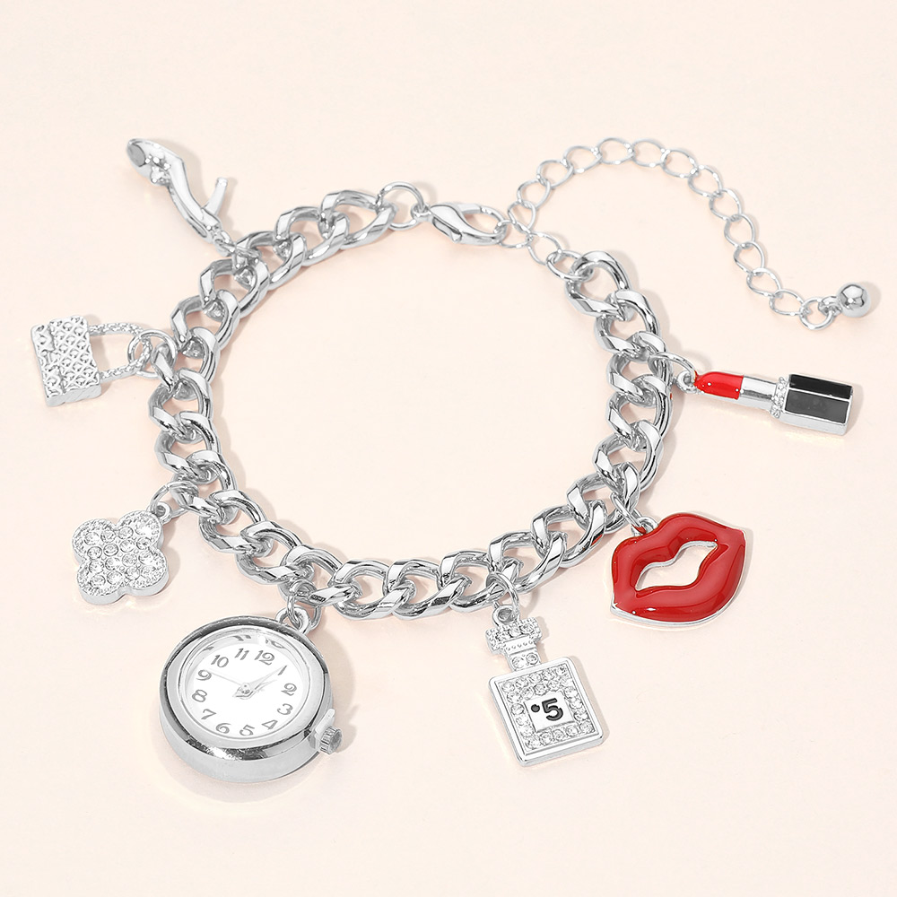 Gold Dipped Quatrefoil High Heel Lips Lipstick Charm Watch Bracelet