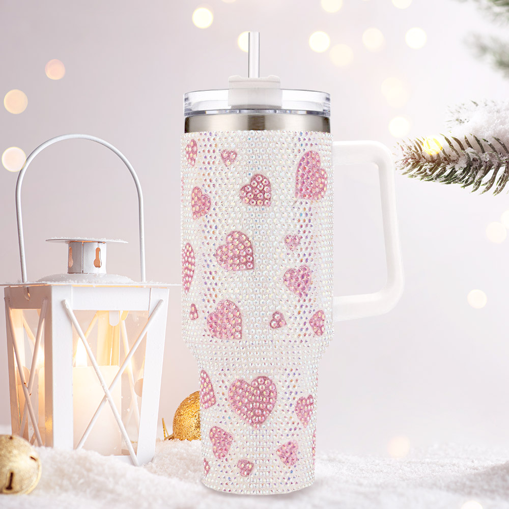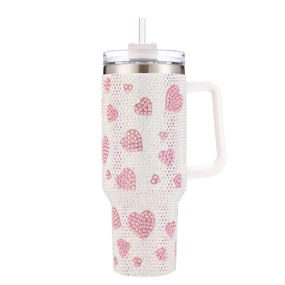 Details • Tumbler Size : 4" X 10.5" (40oz) • BPA Free • Hot and Cold • Double Wall Vacuum Insulation • 1 Lid, 1 Straw and 2 Brushes Included • Extra Stones Included • Sparkling 40oz insulated tumbler adorned with rhinestone heart accents, designed with a sturdy handle and reusable straw. Keeps drinks hot or cold for hours. Perfect for gifting, travel, daily hydration, and adding a touch of glamour to any routine. • Stainless Steel