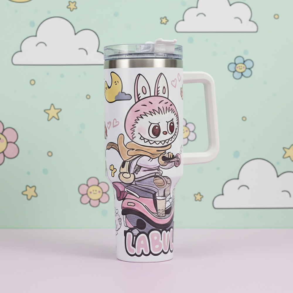 • Add fun to your daily routine with this monster bunny cartoon character travel tumbler. Featuring a playful design with cute graphics, a sturdy handle, and secure lid, this 40oz tumbler keeps drinks hot or cold. Perfect for collectors, fans of quirky style, or anyone who enjoys unique drinkware.