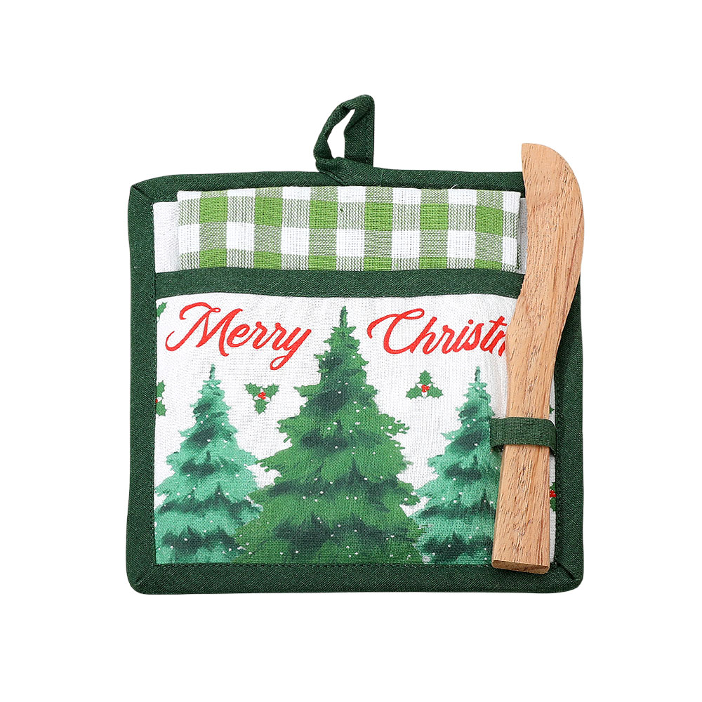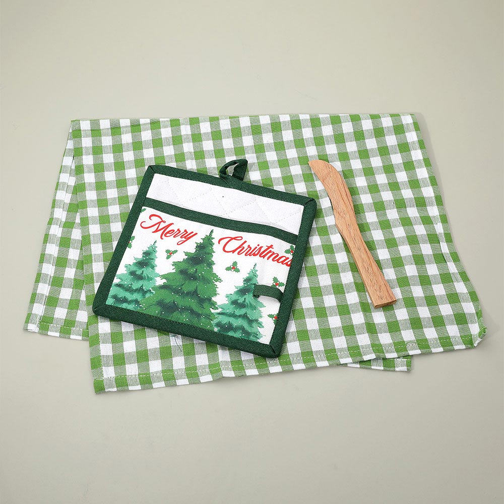 Details • Towel Size : 15" X 25" • Potholder Size : 7.75" X 7.75" • Spreader Size : 1" X 7.75" • Material : 100% Cotton • Celebrate the season in your kitchen with this Merry Christmas potholder featuring festive tree artwork and a wooden spreader. Perfect for cooking, baking, and gifting, it combines practicality with cheerful holiday style for a warm seasonal touch. • Made In India