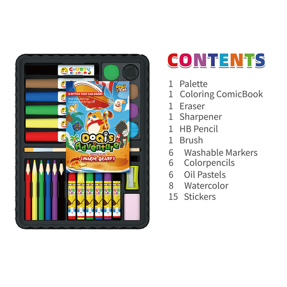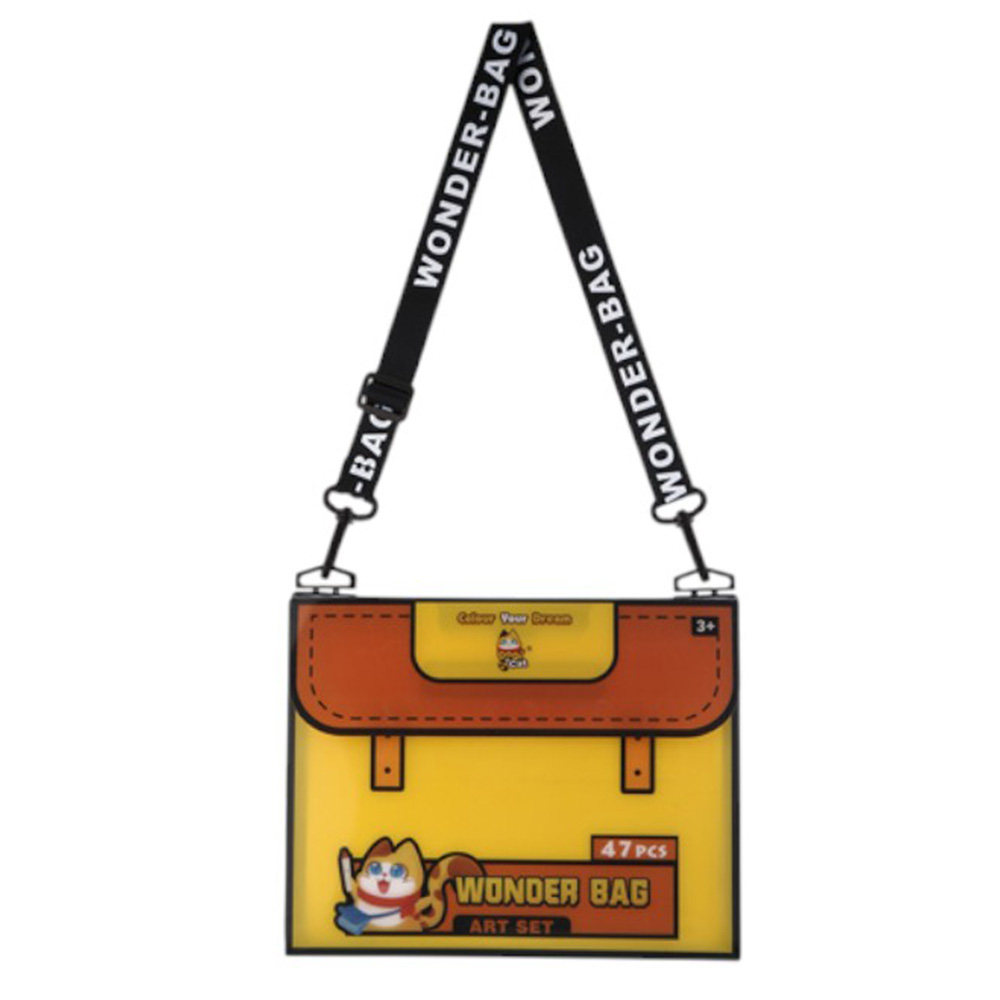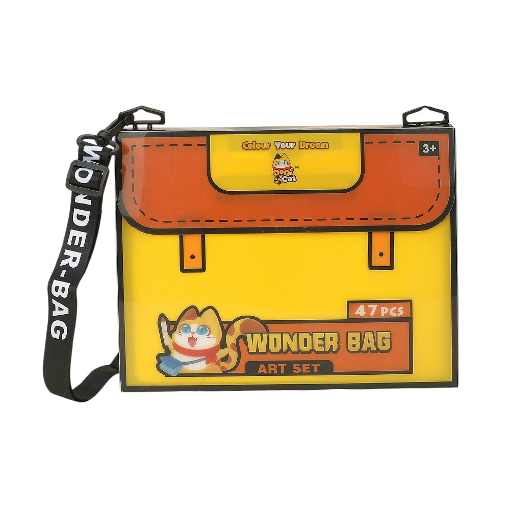 Details • Size : 10.25" X 8" X 12" • Strap Size : 47" L / Adjustable, Detachable • 6 Washable Markers, 6 Color Pencil Crayons, 1 Coloring Comic Book, 1 Eraser, 1 Sharpener, 1 Brush, 1 HB Pencil, 1 Palette, 8 Watercolor, 15 Stickers and 6 Color Pencils Included • Inspire creativity with this 47-piece kids art set featuring pencils, markers, paints, crayons, and more. Packed in a fun, easy-to-carry shoulder bag, it’s perfect for school projects, travel, or at-home art fun—designed to make every creative moment colorful and imaginative.