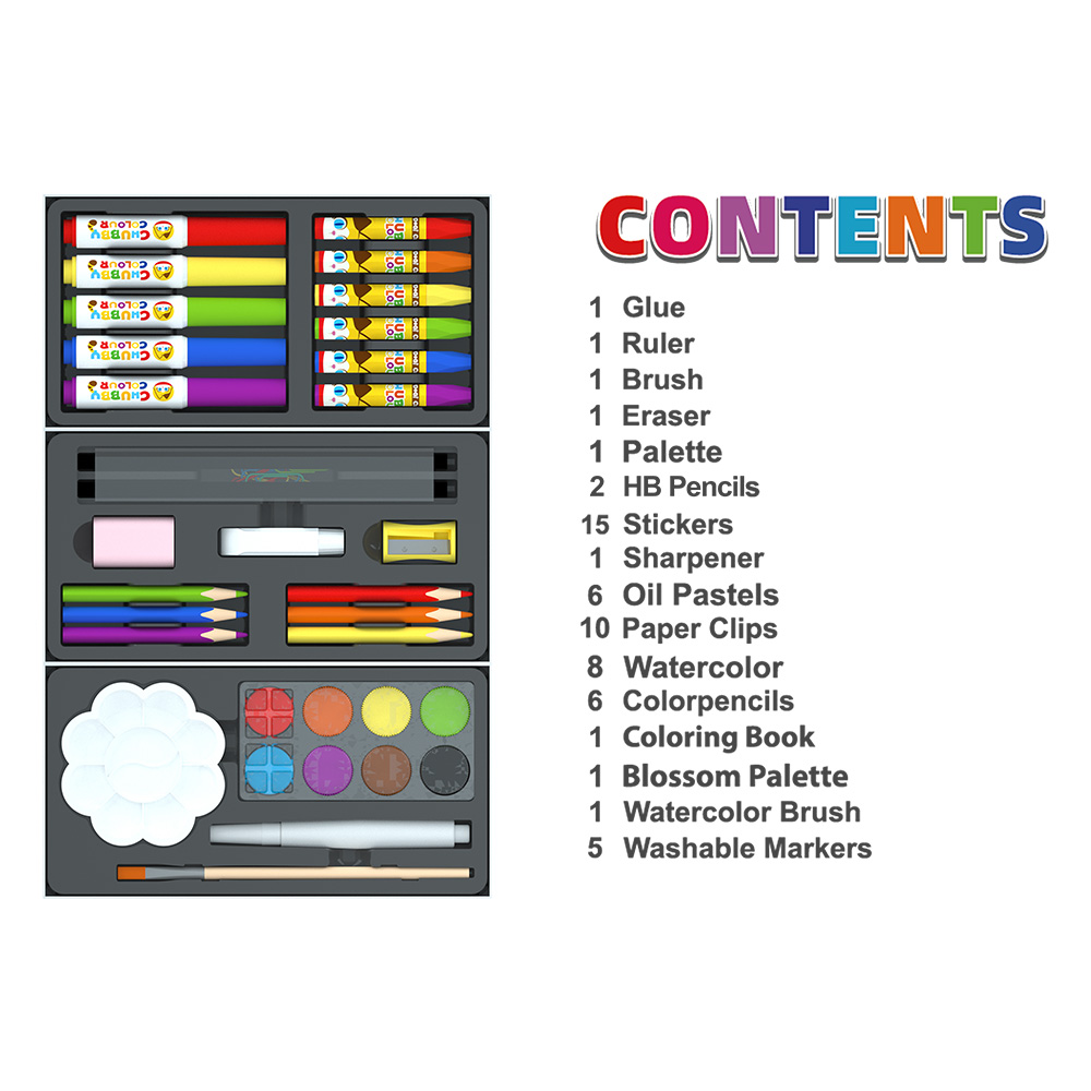 • 1 Ruler, 1 Brush, 1 Eraser, 1 Palette, 15 Stickers, 2 HB Pencils, 1 Blossom Palette, 1 Watercolor Brush, 5 Washable Markers, 1 Coloring Book, 8 Watercolor, 1 Sharpener, 6 Oil Pastels, 6 Color Pencils, 10 Paper Clips Included