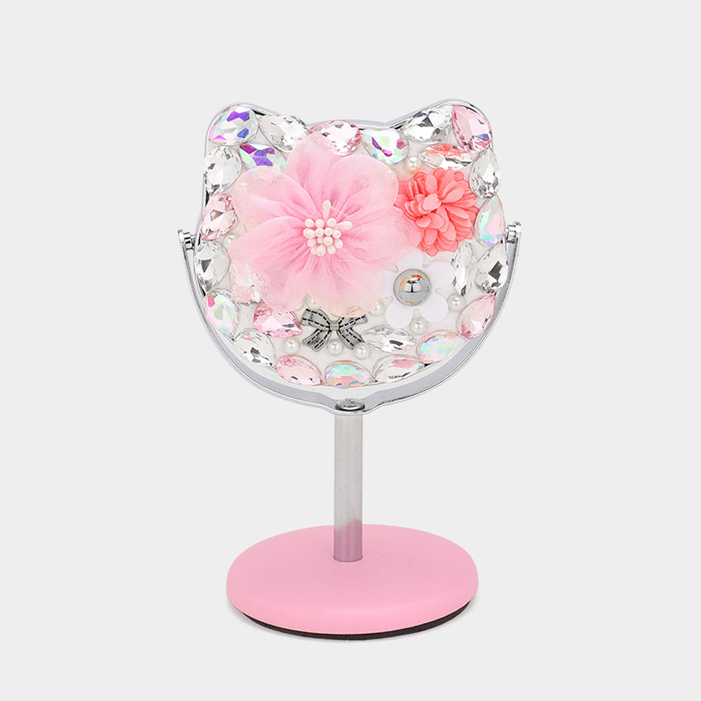 Flower Pearl Stone Embellished Cat Ear Pointed Makeup Tabletop Swivel Mirror