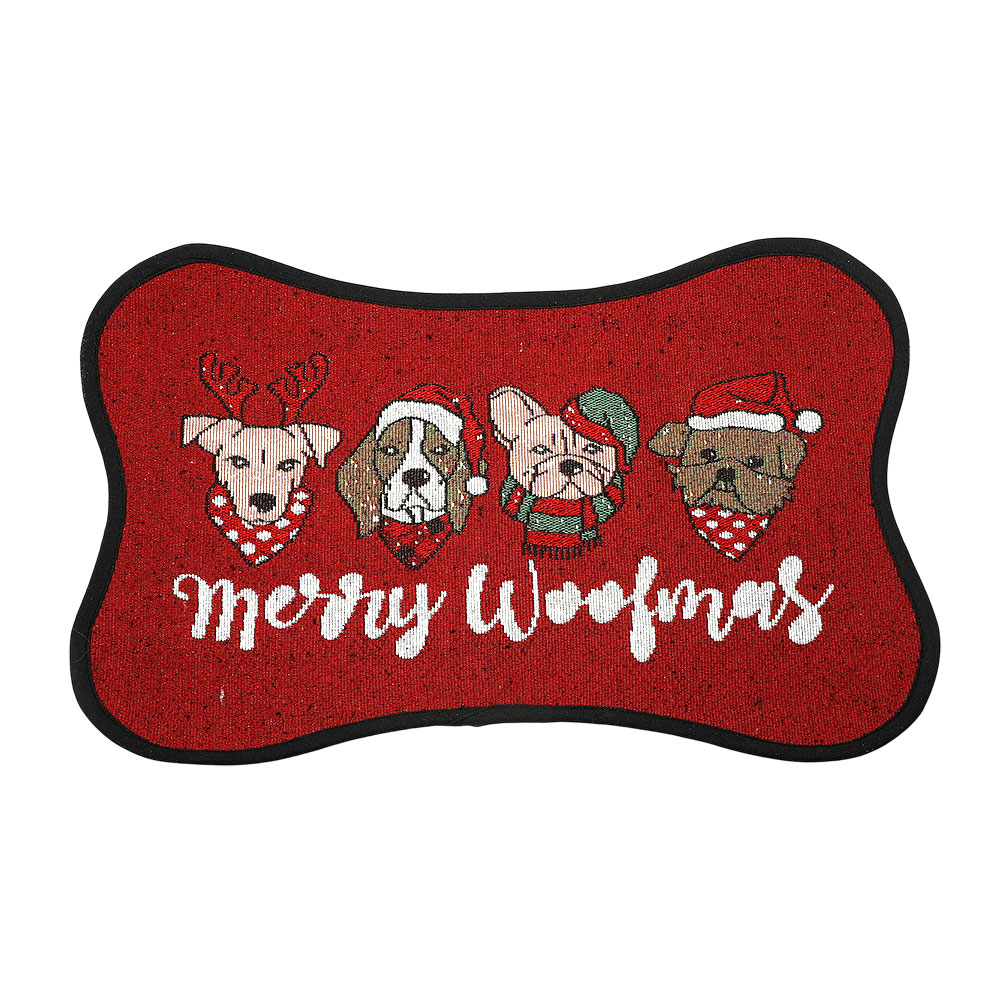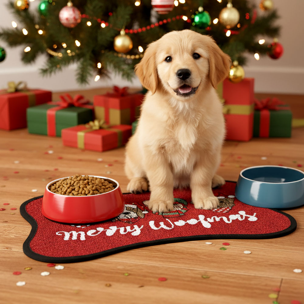 • Celebrate the holidays with this festive bone-shaped pet bowl mat featuring adorable dogs in seasonal outfits and a “Merry Woofmas” message. Perfect for keeping your pet’s feeding area tidy while adding holiday charm and playful style to your dĂ©cor.