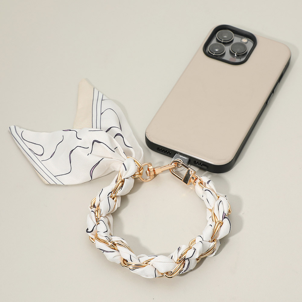 • Upgrade your phone style with this elegant scarf chain wrist strap, combining a braided design with metallic links for a chic and functional look. The soft scarf accent adds flair while providing a comfortable grip, making it perfect for carrying your phone in effortless fashion.