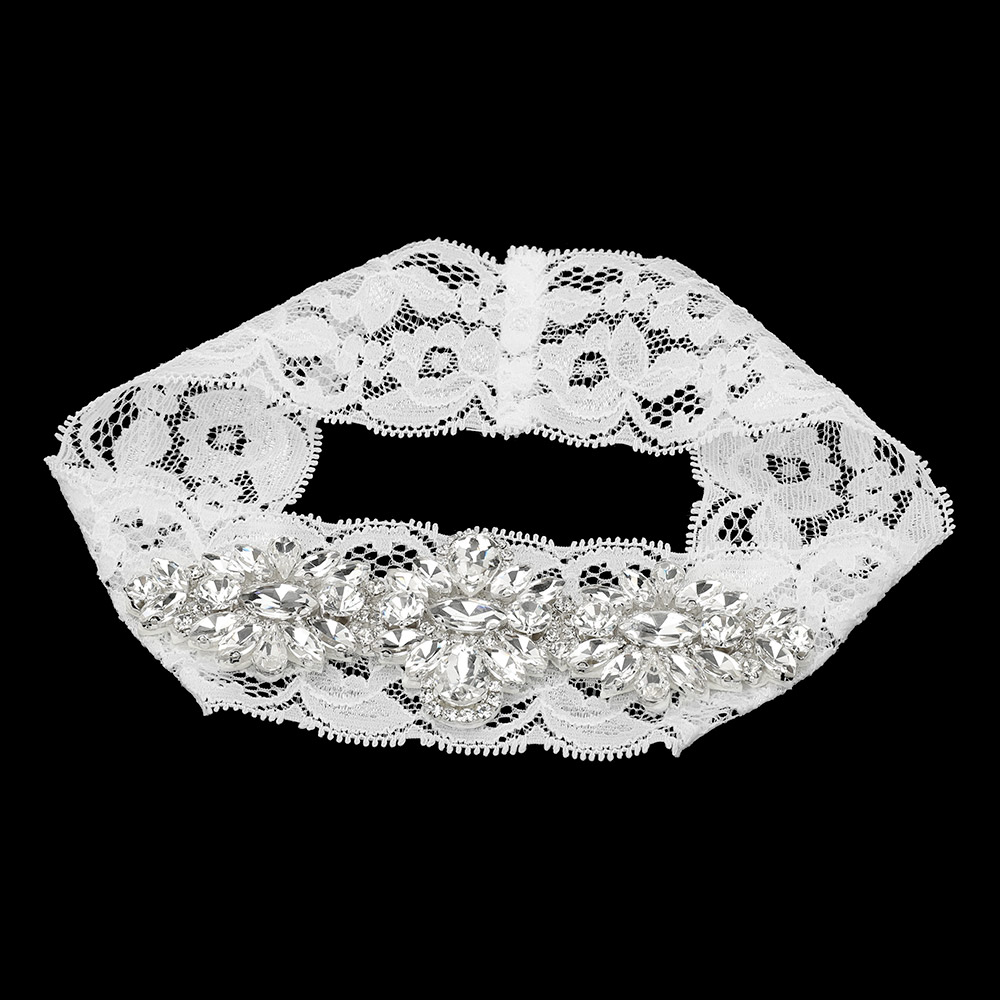 • The garter itself is made of intricate white lace and features a sparkling embellishment of clear crystals or rhinestones arranged in a decorative pattern. The lace has a scalloped edge, adding to its feminine and elegant look.