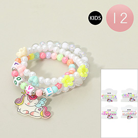 12 SET OF 3 - Kids Unicorn Charm Flower Pearl Beaded Stretch Multi Layered Bracelets