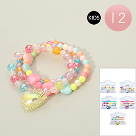 12 SET OF 3 - Kids HEart Charm Faceted Beaded Stretch Multi Layered Bracelets